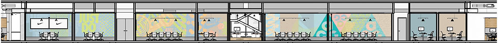 Large runs of meeting rooms on each floor are treated a continuous gradient of patterns and Nike iconography.